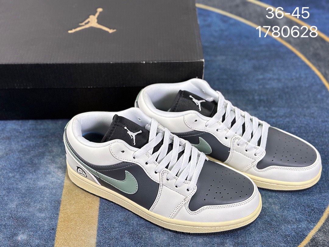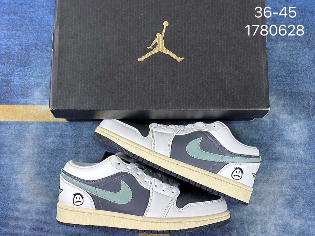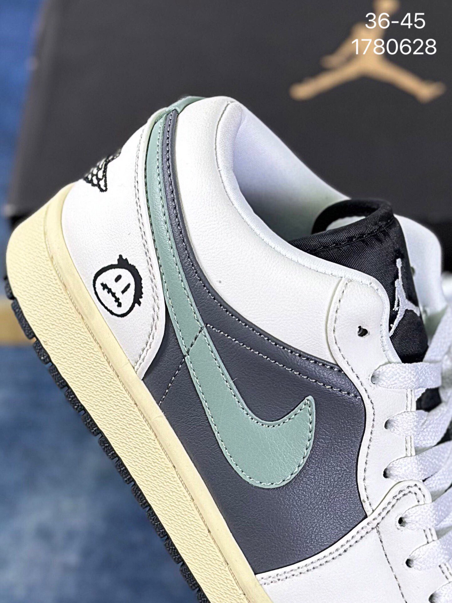 A playful collaborative sneaker from Air Jordan and Cartoon Smiley, featuring a fresh color-block of white, grey and mint green paired with a vintage cream sole for retro street vibe: crafted from premium leather, the side is adorned with the iconic cartoon smiley graffiti logo, while the tongue retains AJ’s classic Jumpman element—doubling down on recognition. Perforated toe boxes balance texture and wearing comfort; it comes with Air Jordan’s exclusive brand shoe box, embodying the collaborative design’s trendy tone, perfect for daily streetwear and casual outings.