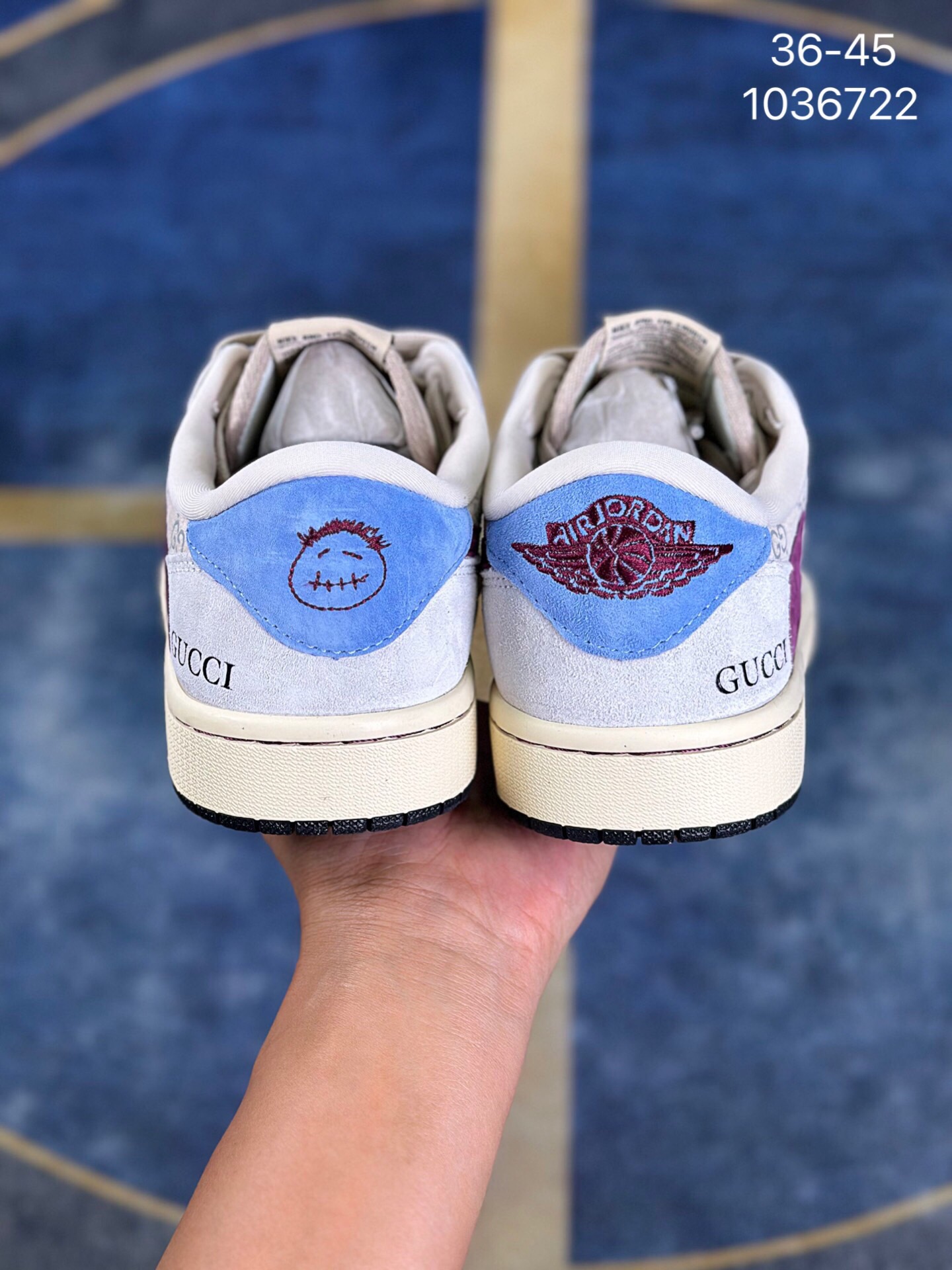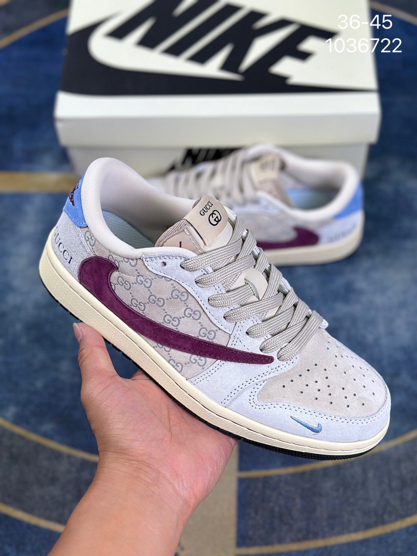 A luxury collaborative sneaker from Gucci and Nike, featuring a vintage color-block of light grey, burgundy and light blue: the upper combines suede and Double G print fabric for rich textural layers; the burgundy Swoosh on the side and light blue heel logo boost collaborative recognition; perforated toe boxes ensure wearing comfort, while the vintage cream sole adds retro vibe. It comes with Gucci’s exclusive brand shoe box, embodying the luxurious tone of the high-end collaboration—perfect for sophisticated daily wear and retro street styling.