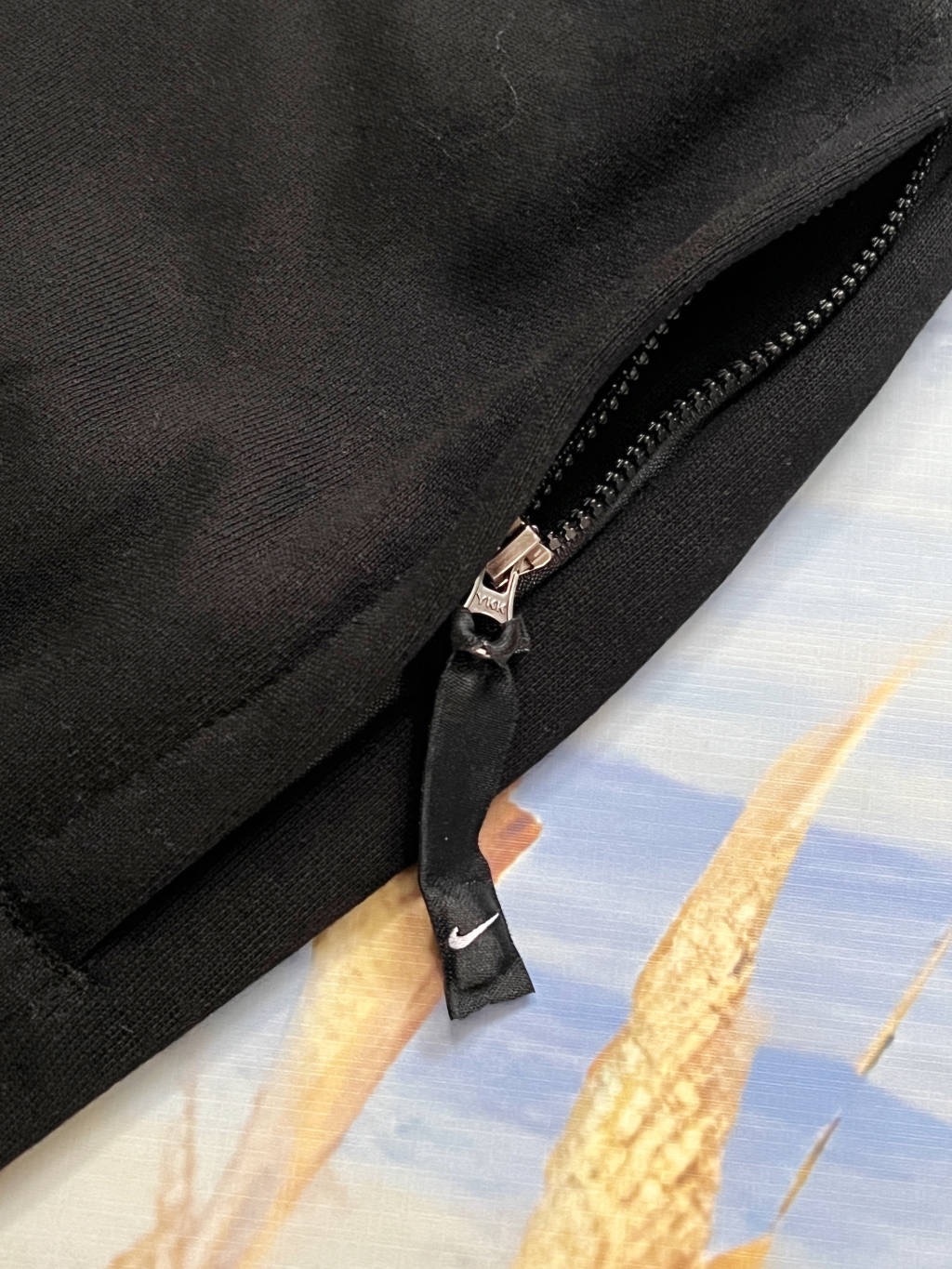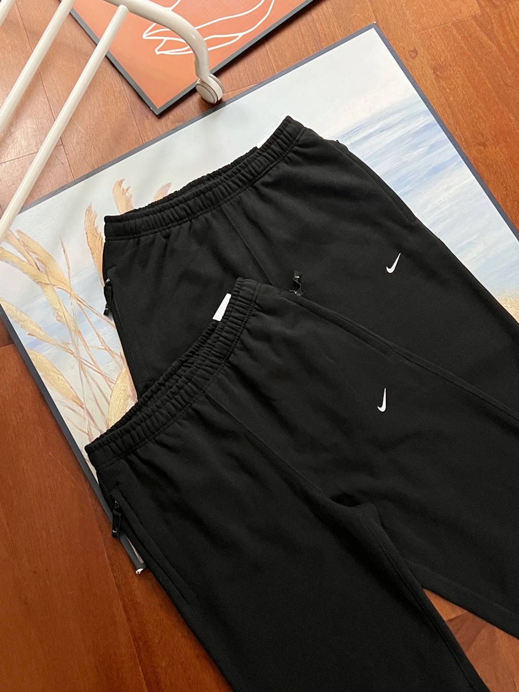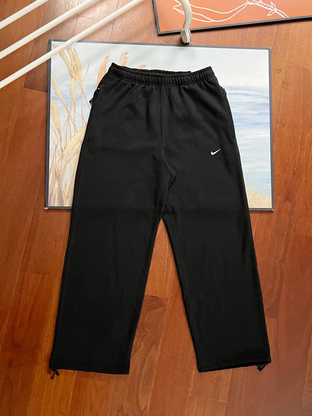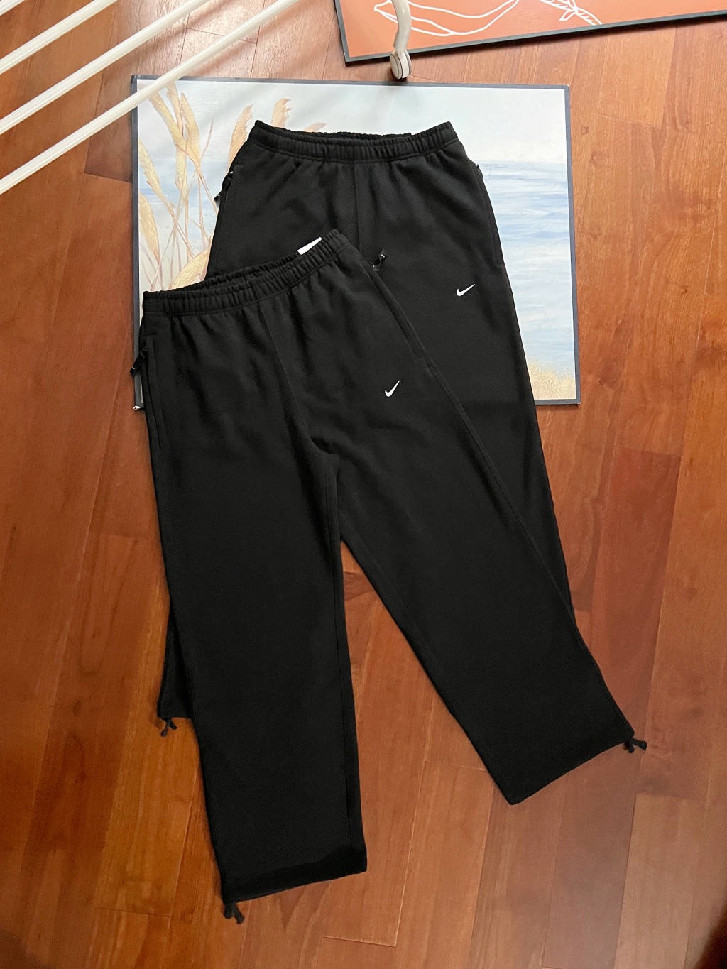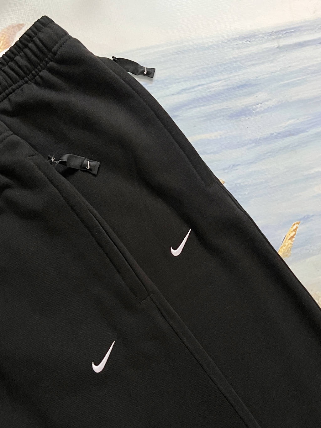 This is Nike’s swoosh logo cuffed casual sweatpants, with solid black as the base color and classic white swoosh, presenting a minimalist and versatile style. The cuffs feature an adjustable drawstring design, allowing switching between loose or cuffed styles according to styling needs; the fabric is made of soft knit material, skin-friendly and breathable (fleece-lined versions are suitable for autumn and winter warmth), applicable to daily streetwear, home leisure, light commuting and other scenarios. The elastic waistband fits different body types, and the side pockets meet basic storage needs, serving as a practical basic bottom for creating a casual relaxed style.